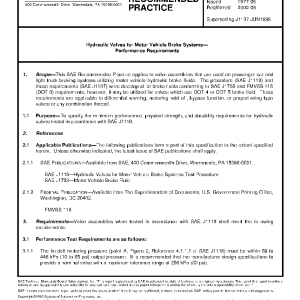 This SAE Recommended Practice applies to valve assemblies that are used on passenger car and light truck braking systems utilizing motor vehicle hydraulic brake fluids. The procedure (SAE J1118) and these requirements (SAE J1137) were developed for brake fluids conforming to SAE J1703 and FMVSS 116 (DOT 3) requirements; however, it may be utilized for valves which use DOT 4 or DOT 5 brake fluid. These requirements are applicable to differential warning, metering hold off, bypass function, or proportioning type valves or any combination thereof.