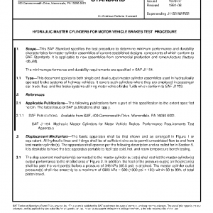 This SAE Standard specifies the test procedure to determine minimum performance and durability characteristics for master cylinder assemblies of current established designs, components of which conform to SAE Standards. It is applicable to new assemblies from commercial production and remanufacture (factory rebuild).