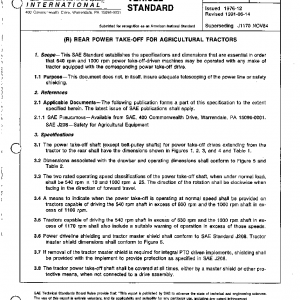 This SAE Standard establishes the specifications and dimensions that are essential in order that 540 rpm and 1000 rpm power take-off-driven machines may be operated with any make of tractor equipped with the corresponding power take-off drive.