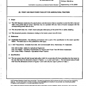 This SAE Standard establishes the specifications and dimensions that are essential in order that 540 r/min and 1000 r/min power take-off-driven machines may be operated with any make of tractor equipped with the corresponding power take-off drive. This document does not, in itself, insure adequate telescoping of the power line or safety shielding. This document provides dimensions relating to the tractor power take-off shield.