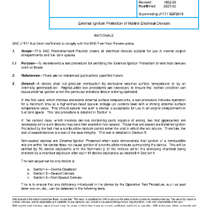 This SAE Recommended Practice covers all electrical devices suitable for use in marine engine compartments and fuel tank spaces.