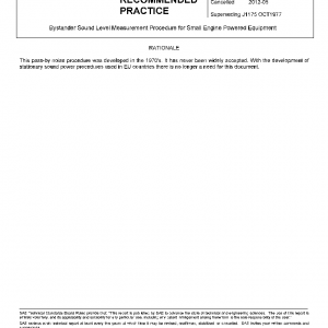 This SAE Recommended Practice establishes the instrumentation and procedure to be used in measuring the bystandard sound level of engine powered equipment under 15 kW (20 bhp) typical of their normal operation. It is intended to include equipment such as lawn mowers, snow blowers, and tillers. It is not intended to include equipment designed primarily for operation on highways or within factories and buildings, or vehicles such as motorcycles, snowmobiles, and pleasure motorboats that are covered by other SAE Standards or Recommended Practices. This procedure does not cover chain saws. The SAE Recommended Practice may also be used when measuring the bystander sound level on similar equipment powered by electricity or other power sources.