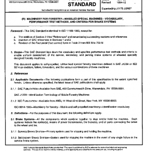 This SAE Standard lays down the vocabulary and specifies performance test methods and criteria to enable uniform assessment of the service, secondary, and parking brake systems of wheeled specially designed forestry machines.