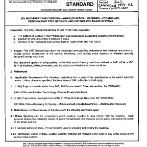 This SAE Standard lays down the vocabulary and specifies performance test methods and criteria to enable uniform assessment of the service, secondary, and parking brake systems of wheeled specially designed forestry machines. This document applies to self-propelled, rubber-tired special forestry machines defined in SAE J1209 or ISO 6814 as skidders, fellers, forwarders, and the various combinations of these machines.