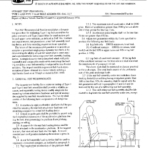This SAE Recommended Practice establishes a dynamic test procedure for evaluating Type 1 lap belt assemblies for pelvic restraints and Type 2 assemblies for combination pelvic and upper torso restraints, as defined in SAE J4c. Uniform test requirements, test procedures, a seat belt assembly loading device, and data recording requirements are specified.