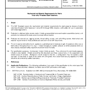 This SAE Standard covers the mechanical and material requirements for eight property classes of steel, externally threaded metric fasteners in sizes M1.6 through M36, inclusive, and suitable for use in automotive and related applications.
