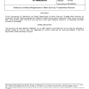 This SAE Standard covers the mechanical and material requirements for eight property classes of steel, externally threaded metric fasteners in sizes M1.6 through M36, inclusive, and suitable for use in automotive and related applications.