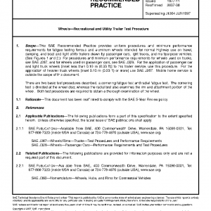 This SAE Recommended Practice provides uniform procedures and minimum performance requirements for fatigue testing ferrous and aluminum wheels intended for normal highway use on travel, camping, and boat and light utility trailers drawn by passenger cars, light trucks, and multipurpose vehicles. (See Figures 1 and 2.) For procedures and minimum performance requirements for wheels used on trucks, see SAE J267, and for wheels used on passenger cars, see SAE J328. For the application of passenger car and light truck wheels [inset less than 0.10 m (0.33 ft)] to this trailer service, use this procedure. For the application of heavier truck wheels [inset 0.10 m (0.33 ft) or more] use SAE J267. Mobile home service is outside the scope of this document.