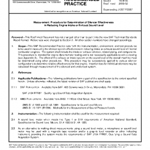 This SAE Recommended Practice sets forth the instrumentation, environment, and test procedures to be used in measuring the silencer system effectiveness in reducing intake or exhaust sound level of internal combustion engines. The system shall include the intake or exhaust silencer, related piping, and components. This procedure is intended for engine-dynamometer testing and is not necessarily applicable to vehicle testing (see Appendix A). The effect of the exhaust or intake system on the sound level of the overall machine must be determined using other procedures. This procedure may be successively applied to various silencer configurations to determine relative effectiveness for that engine. Insertion loss for individual silencers may be calculated through measurement of the silenced and unsilenced system.