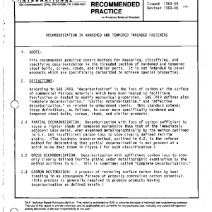 This recommended practice covers methods for measuring, classifying, and specifying decarburization in the threaded section of hardened and tempered steel bolts, screws, studs, and similar parts. It is not intended to cover products which are specifically carburized to achieve special properties.