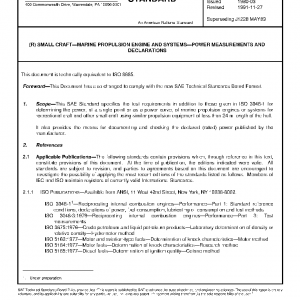 This SAE Standard specifies the test requirements in addition to those given in ISO 3046-1 for determining the power, at a single point or as a power curve, of marine propulsion engines or systems for recreational craft and other small craft using similar propulsion equipment of less than 24 m length of the hull.
