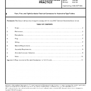 This SAE Recommended Practice covers the wiring and rectangularly shaped connector standards for all types of trailers whose gross weight does not exceed 4540 kg (10 000 lb). These trailers are grouped in SAE J684 with running light circuit loads not to exceed 7.5 A per circuit. This document provides circuits for lighting, electric brakes, trailer battery charging, and an auxiliary circuit color code and protection for the wiring from hazards or short circuits. Color code is compatible with SAE J560 and ISO 1724-1980(E).