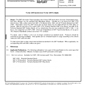 This SAE Information Report provides a list of those SAE steels which, because of decreased usage, have been deleted from the standard SAE Handbook listings. Included are alloy steels from SAE J778 deleted since 1936, carbon steels from SAE J118 deleted since 1952, and all EX-steels deleted from SAE J1081. Information concerning SAE steels prior to these dates may be obtained from the SAE office on request. With the issuance of this report, SAE J778, Formerly Standard SAE Alloy Steels, and SAE J118, Formerly Standard SAE Carbon Steels, will be retired since they are now combined in SAE J1249. In the future, new assignments to SAE J1081, Chemical Compositions of SAE Experimental Steels, will be given “PS” (Potential Standard) numbers rather than “EX” numbers.