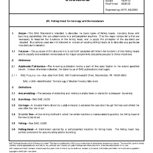 This SAE Standard is intended to describe the basic types of felling heads, including those with bunching capabilities, that are attachments to a self-propelled machine. Only the major components that are necessary to describe the functions of the felling head, and to apply the principles of the standard are included. Illustrations used are not intended to include all existing felling heads or to describe any particular manufacturer’s variation.