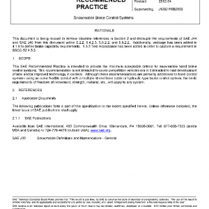 This SAE Recommended Practice is intended to provide the minimum acceptable criteria for snowmobile hand brake control systems. This recommendation is not intended to cover competition vehicles nor is it intended to limit development of new and/or improved technology in controls. Although these recommendations are primarily addressed to hand control systems using an outer flexible conduit with a multiple strand inner cable or hydraulic type brake control system, the basic requirements of freedom of movement, strength, material, etc., will apply to any system.