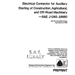 This SAE Recommended Practice covers the details, dimensions, and design of the parts of both plug and receptacle which must mate properly to permit interchangeable use of different makes of connectors. It provides the auxiliary starting circuit of the machine with a universal connecting device, fool-proof polarity, standard circuit coding, and protection for the wiring and equipment from electrical shorts.