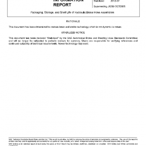 This SAE Information Report is the listing of recommendations for the proper packaging, storage, and shelf life limitations of new and unused hydraulic brake hose assemblies. The document embodies the testing, analysis, and experience of many users and manufacturers. Where specific manufacturer’s recommendations are made, those recommendations shall supersede the recommendations of this document.