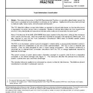 The scope and purpose of this SAE Recommended Practice is to provide a classification system for deformation sustained by trucks involved in collisions on the highway. Application of the document is limited to medium trucks, heavy trucks, and articulated combinations.1