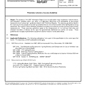 The purpose of this SAE Information Report is to list and explain major equipment, instrumentation, and procedure variables which can affect inter-laboratory differences and repeatability of photometric measurements of various lighting devices listed in SAE Technical Reports. The accuracy guidelines listed in the report are for the purpose of controlling variables that are not a direct function of the lighting device being measured. The control of these individual variables is necessary to control the overall accuracy of photometric measurements. These accuracy guidelines apply to the measurement of the luminous intensities and reflected intensities of devices at the specified geometrically distributed test points and areas. These guidelines do not apply to photometric equipment used to measure license plate lamps.