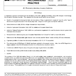The purpose of this SAE Information Report is to list and explain major equipment, instrumentation, and procedure variables which can affect inter-laboratory differences and repeatability of photometric measurements of various lighting devices listed in SAE Technical Reports. The accuracy guidelines listed in the report are for the purpose of controlling variables that are not a direct function of the lighting device being measured. The control of these individual variables is necessary to control the overall accuracy of photometric measurements. These accuracy guidelines apply to the measurement of the luminous intensities and reflected intensities of devices at the specified geometrically distributed test points and areas. These guidelines do not apply to photometric equipment used to measure license plate lamps.