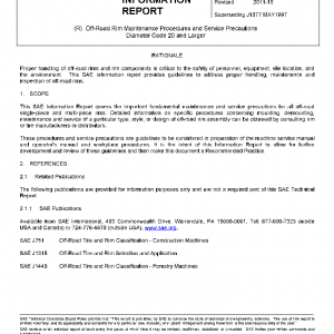 This SAE Information Report covers the important fundamental maintenance and service precautions for all off-road single-piece and multi-piece rims. Detailed information on specific procedures concerning mounting, demounting, maintenance and service of a particular type, style, or design of off-road rim assembly can be obtained by consulting rim or tire manufacturers or distributors.