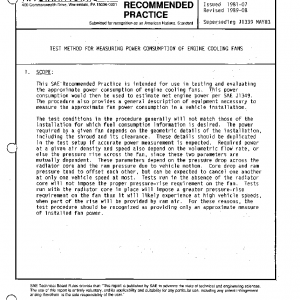 This SAE Recommended Practice is intended for use in testing and evaluating the approximate power consumption of engine cooling fans. This power consumption would then be used to estimate net engine power per SAE J1349. The procedure also provides a general description of equipment necessary to measure the approximate fan power consumption in a vehicle installation.