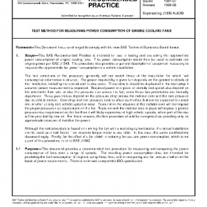 This SAE Recommended Practice is intended for use in testing and evaluating the approximate power consumption of engine cooling fans. This power consumption would then be used to estimate net engine power per SAE J1349. The procedure also provides a general description of equipment necessary to measure the approximate fan power consumption in a vehicle installation.