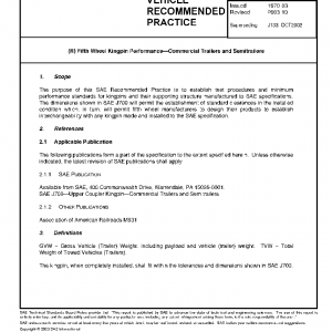 The purpose of this SAE Recommended Practice is to establish test procedures and minimum performance standards for kingpins and their supporting structure manufactured to SAE specifications. The dimensions shown in SAE J700 will permit the establishment of standard clearances in the installed condition which, in turn, will permit fifth wheel manufacturers to design their products to establish interchangeability with any kingpin made and installed to the SAE specification.