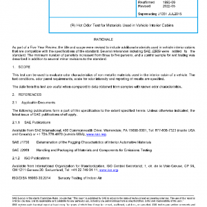 This test can be used to evaluate odor characteristics of non-metallic materials used in the interior cabin of a vehicle. The test conditions, odor panel requirements, scale for odor intensity and reporting of results are specified.
