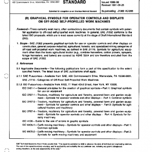 SAE J1362 presents graphical symbols for use on operator controls and other displays on construction, general purpose industrial, agricultural, forestry, and specialized mining categories of off-road self-propelled work machines, as defined in SAE J1116. Symbols for agricultural equipment other than the basic agricultural tractor (e.g., combine harvesters, cotton pickers, sprayers, forage harvesters, and balers) are covered by ASAE S304 and are therefore excluded from the scope of SAE J1362.
