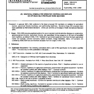 SAE J1362 presents graphical symbols for use on operator controls and other displays on construction, general-purpose industrial, agricultural, forestry, and specialized mining categories of off-road self-propelled work machines, as defined in SAE J1116. Symbols for agricultural equipment other than the basic agricultural tractor (for example, combine harvesters, cotton harvesters, forage harvesters, balers, and sprayers) are covered by ASAE S304 and are therefore excluded from the scope of SAE J1362.