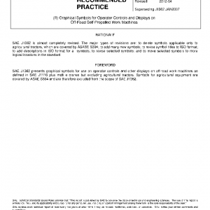 SAE J1362 presents graphical symbols for use on operator controls and other displays on off-road work machines as defined in SAE J1116 plus mobile cranes but excluding agricultural tractors. Symbols for agricultural tractors are covered by ASABE S304, ISO 3767-1, and ISO 3767-2.