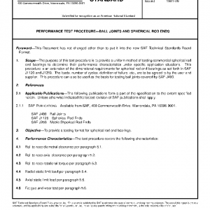 The purpose of this test procedure is to provide a uniform method of testing commercial spherical rod end bearings to determine their performance characteristics under specific application situations. This procedure is an extension of the dimensional requirements for spherical rod end bearings as set forth in SAE J1120 and J1259. The loads, number of cycles, definition of failure, etc., are to be agreed to by the user and supplier. This procedure can also be used as the basis for testing ball joints covered by SAE J490.