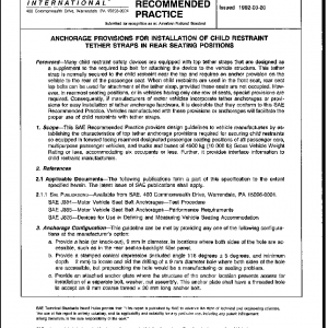 This SAE Recommended Practice provides design guidelines to vehicle manufacturers by establishing the characteristics of top tether anchorage provisions required for securing child restraints so equipped in forward facing rearmost designated passenger seating positions of all passenger cars, multipurpose passenger vehicles, and trucks and buses of 4500 kg (10 000 lb) Gross Vehicle Weight Rating or less, accommodating six occupants or less. Further, it provides interface information to child restraint manufacturers.