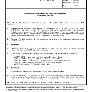 This SAE document defines classification, nomenclature, and dimensional specifications for trenching machines.