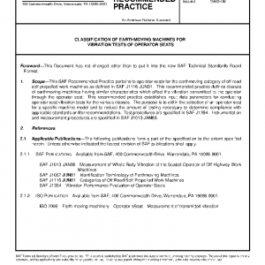 This SAE Recommended Practice pertains to operator seats for the earthmoving category of off-road self-propelled work machines as defined in SAE J1116 JUN81. This recommended practice defines classes of earthmoving machines having similar characteristics which affect the vibration transmitted to the operator through the operator seat. This recommended practice establishes input data parameters for conducting operator seat vibration tests for the various classes. The purpose is to aid in the selection of an operator seat for a specific machine model and to reduce the amount of testing necessary to determine compliance with applicable standards and/or recommendations. Test procedures are specified in SAE J1384. Instrumentation and measurement procedures are specified in SAE J1013 JAN80.