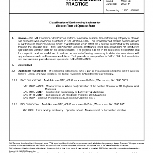 This SAE Recommended Practice pertains to operator seats for the earthmoving category of off-road self-propelled work machines as defined in SAE J1116 JUN81. This recommended practice defines classes of earthmoving machines having similar characteristics which affect the vibration transmitted to the operator through the operator seat. This recommended practice establishes input data parameters for conducting operator seat vibration tests for the various classes. The purpose is to aid in the selection of an operator seat for a specific machine model and to reduce the amount of testing necessary to determine compliance with applicable standards and/or recommendations. Test procedures are specified in SAE J1384. Instrumentation and measurement procedures are specified in SAE J1013 JAN80.