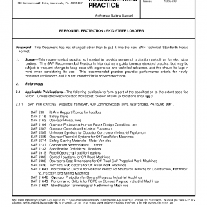 This recommended practice is intended to provide personnel protection guidelines for skid steer loaders. This SAE Recommended Practice is intended as a guide towards standard practice, but may be subject to frequent change to keep pace with experience and technical advances, and this should be kept in mind when considering its use. This recommended practice provides performance criteria for newly-manufactured loaders and it is not intended for in-service machines.