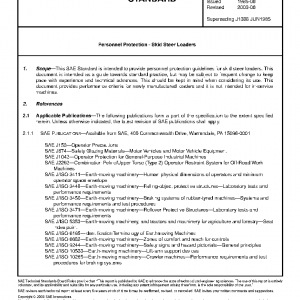 This SAE Standard is intended to provide personnel protection guidelines for skid steer loaders. This document is intended as a guide towards standard practice, but may be subject to frequent change to keep pace with experience and technical advances. This should be kept in mind when considering its use. This document provides performance criteria for newly manufactured loaders and it is not intended for in-service machines.