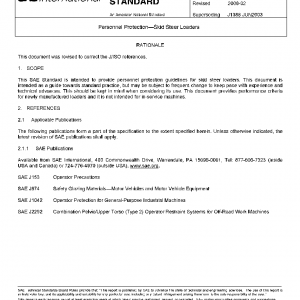 This SAE Standard is intended to provide personnel protection guidelines for skid steer loaders. This document is intended as a guide towards standard practice, but may be subject to frequent change to keep pace with experience and technical advances. This should be kept in mind when considering its use. This document provides performance criteria for newly manufactured loaders and it is not intended for in-service machines.