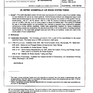 This SAE Standard covers the minimum requirements for metric sizes of nonmetallic tubing as manufactured for use in air brake systems. Nonreinforced products are designated type A and reinforced products type B. It is not intended to cover tubing for any portion of the system that operates below −40 °C (−40 °F), above +93 °C (+200 °F), above a maximum working gage pressure of 1.0 MPa (150 psi), or in an area subject to attack by battery acid. This tubing is intended for use in the brake system for connections that maintain a basically fixed relationship between components during vehicle operation. Coiled tube assemblies required for those installations where flexing occurs are covered by this standard and SAE J1131 to the extent of setting minimum requirements on the essentially straight tube and tube fitting connections, which are used in the construction of such assemblies.2