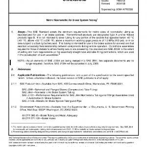 This SAE Standard covers the minimum requirements for metric sizes of nonmetallic tubing as manufactured for use in air brake systems. Nonreinforced products are designated type A and reinforced products type B. It is not intended to cover tubing for any portion of the system that operates below −40 °C (−40 °F), above +93 °C (+200 °F), above a maximum working gage pressure of 1.0 MPa (150 psi), or in an area subject to attack by battery acid. This tubing is intended for use in the brake system for connections that maintain a basically fixed relationship between components during vehicle operation. Coiled tube assemblies required for those installations where flexing occurs are covered by this standard and SAE J1131 to the extent of setting minimum requirements on the essentially straight tube and tube fitting connections, which are used in the construction of such assemblies.2