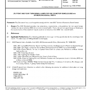 This SAE Technical Report provides test procedures, requirements, and guidelines for turn signal lamps intended for use on vehicles 2032 mm or more in overall width. Front and rear turn signal lamps conforming to the requirements of this document may also be used on vehicles less than 2032 mm in overall width.