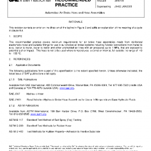 This recommended practice covers minimum requirements for air brake hose assemblies made from reinforced elastomeric hose and suitable fittings for use in automotive air brake systems including flexible connections from frame to axle, tractor to trailer, trailer to trailer and other unshielded air lines with air pressures up to 1 MPa, that are exposed to potential pull or impact. This hose is not to be used where temperatures, external or internal, fall outside the range of -40 to +100 °C.