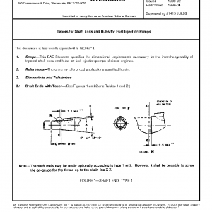 This SAE Standard specifies the dimensional requirements necessary for the interchangeability of tapered shaft ends and hubs for fuel injection pumps of diesel engines.