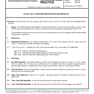 This SAE Recommended Practice describes performance requirements for hardware used in motor vehicle seat belt assemblies when tested in accordance with the test procedures specified in SAE J140.
