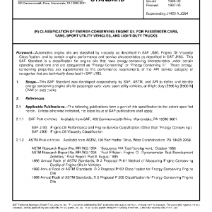 This SAE Standard was developed cooperatively by SAE, ASTM, and API to define and identify energy-conserving engine oils for passenger cars, vans, sport utility vehicles, and light-duty (3856 kg [8500 lb] GVW or less) trucks.
