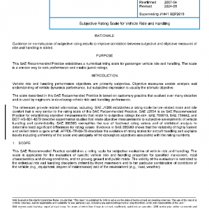 This SAE Recommended Practice establishes a rating scale for subjective evaluation of vehicle ride and handling. The scale is applicable for the evaluation of specific vehicle ride and handling properties for specified maneuvers, road characteristics and driving conditions, and on proving ground and public roads. The validity of the evaluation is restricted to the individual ride and handling disciplines defined by these maneuvers and to the particular combination of conditions of the vehicle (e.g., equipment, degree of maintenance) and of the environment (e.g., road, weather).