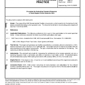 The scope of this SAE Recommended Practice is to provide a uniform practice for the testing of small engine powered alternating current generator sets. This document is limited to reciprocating piston engines of less than 14.9 kW (20 BHP).