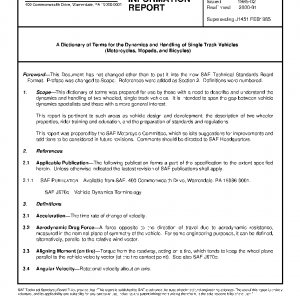 This dictionary of terms was prepared for use by those with a need to describe and understand the dynamics and handling of two-wheeled, single track vehicles. It is intended to span the gap between vehicle dynamics specialists and those with a more general interest.